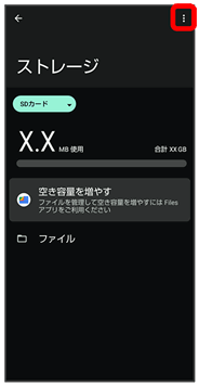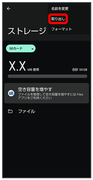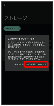 内部ストレージ/SDカードの登録内容は、事故、故障、修理、機種変更などの際や、その他の取り扱いなどによって、消失または変化してしまうことがあります。大切なデータは定期的にバックアップをとっておかれることをおすすめします。なお、データが消失または変化した場合の損害につきましては、当社では責任を負いかねますのであらかじめご了承ください。