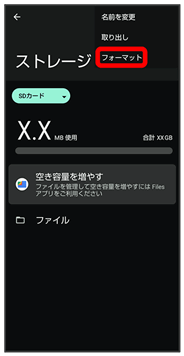フォーマットすると、microSDXCカード内のデータはすべて消去され、異なるファイルシステムに書き換えられ、本来の容量で使用できなくなることがあります。データが破損したmicroSDXCカードの再使用にあたっては、SDXC規格対応機器での再フォーマットが必要です。