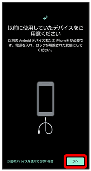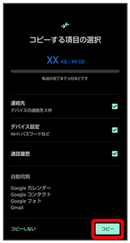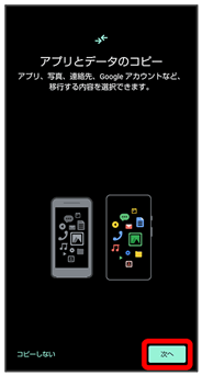 データの引き継ぎは、はじめて本機の電源を入れたときに表示される初期設定画面から行います。初期設定画面の「アプリとデータのコピー」で、画面に従ってスマートフォン同士を接続し、データの引き継ぎを行ってください。