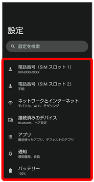| ネットワークとインターネット | Wi-Fiやモバイルネットワーク、テザリングなど、ネットワークやインターネットに関する設定ができます。 | |
