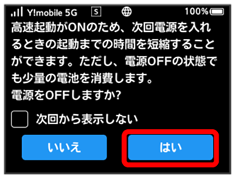 (モバイルネットワーク接続完了アイコン)になったら使用可能です(高速起動設定がONの場合、電源を入れてから約20秒お待ちください)。 - 起動時に警告画面を表示しないようにするには、次回から表示しないにチェックを付けます。