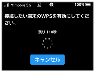 - 次の画面が表示されている間(120秒以内)に、アクセスポイント端末でWPS機能の接続設定を行う