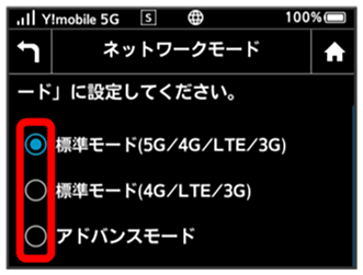 - お買い上げ時のネットワークモードは「標準モード(5G/4G/LTE/3G)」に設定されています。