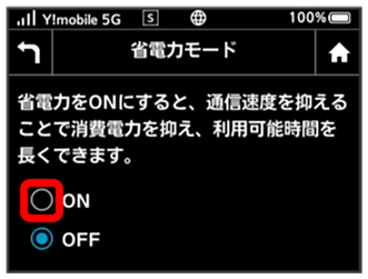 - 省電力モードをONにすると、モバイルネットワーク、Wi-Fiの通信速度が抑えられ、下り最大約2Mbpsまで制限されます。