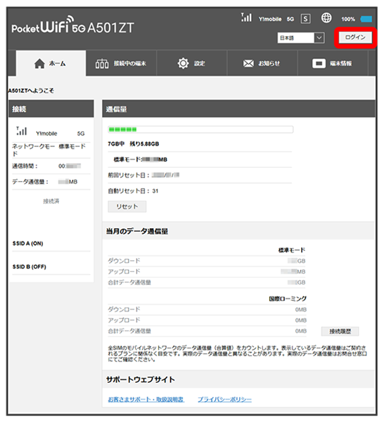 - WEB UIのホーム画面(「ホーム」タブ)でログイン