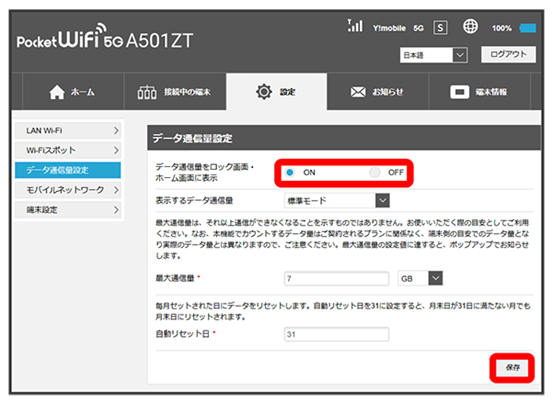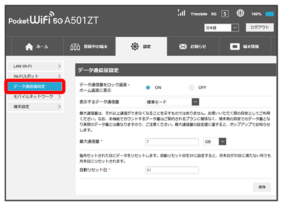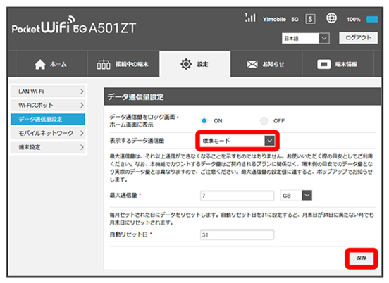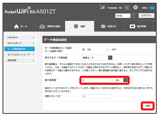 また、表示される最大通信量は契約された料金プランに連動したものではありません。適宜変更してご利用ください。