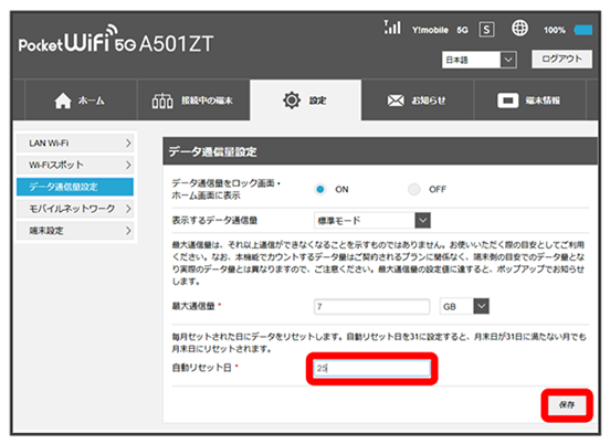 毎月、データ通信量を自動的にリセットする日を設定できます。
