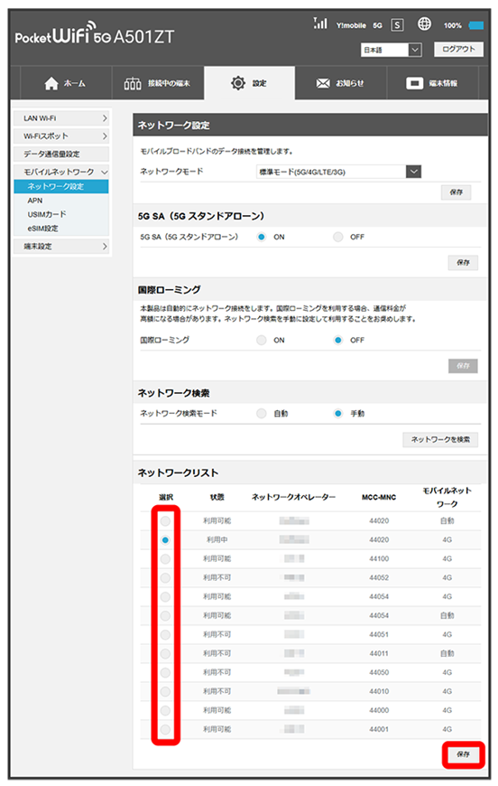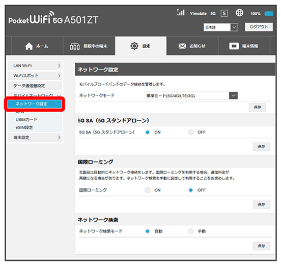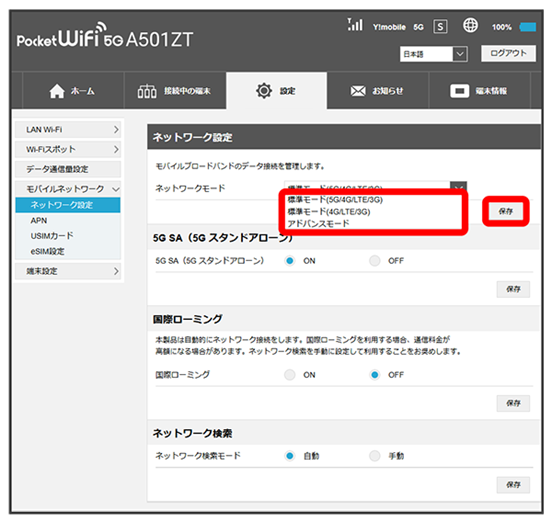 をクリック - 標準モード(5G/4G/LTE/3G)/標準モード(4G/LTE/3G)/アドバンスモード