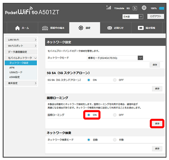 国際ローミングを利用する場合は、ネットワークモードを標準モードに設定してください。ネットワークモードの設定については「ネットワークモードを変更する」を参照してください。