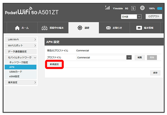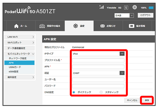 接続先のAPNを追加・変更するには、次の項目を設定して新しいプロファイルを作成します。