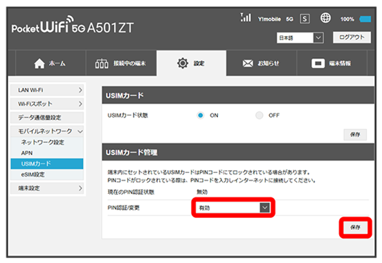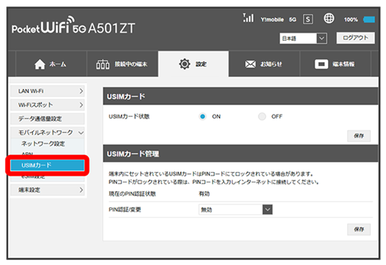 - 「USIMカード状態」がONであることを確認してください。OFFの場合は、ONにチェックを付ける