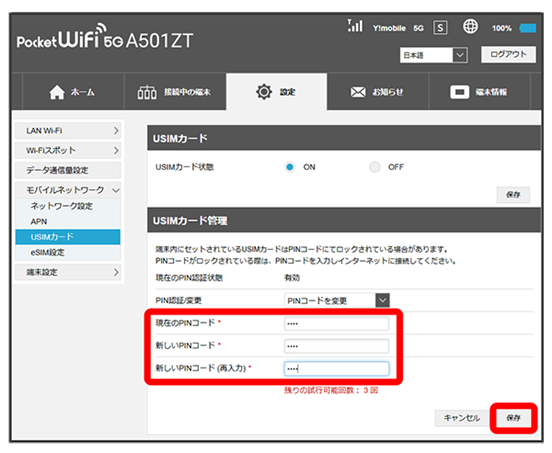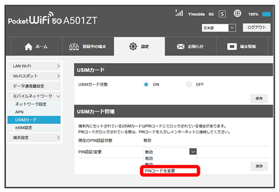 お買い上げ時のUSIMカードのPINコードは、「9999」に設定されています。