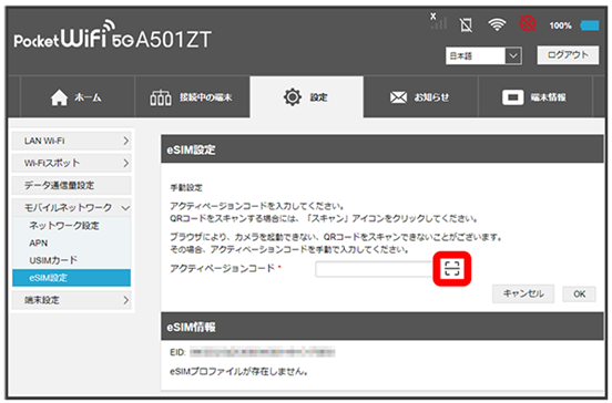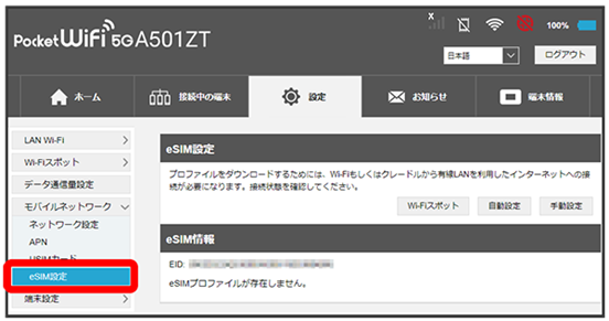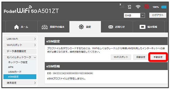 - eSIMがダウンロードされていないことをお知らせする画面が表示された場合は、eSIM設定をクリックしてもeSIM設定画面が表示されます。