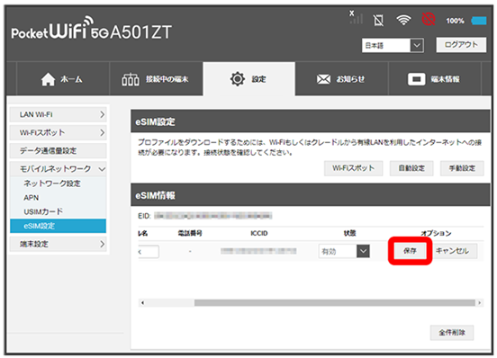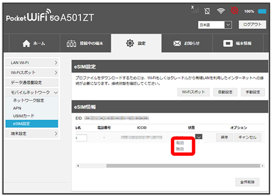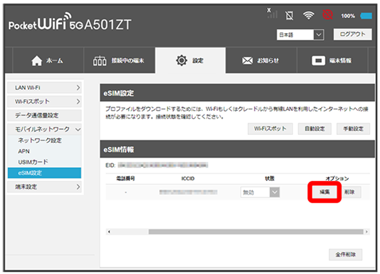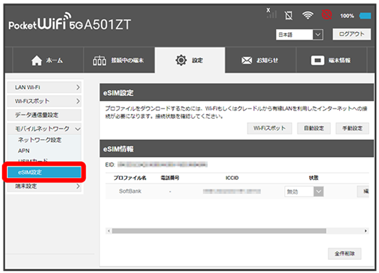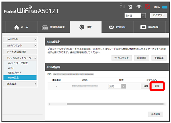 - 全件削除をクリックするとすべてのeSIMが削除されますのでご注意ください。