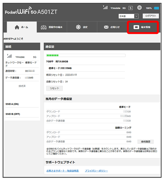 | SSID A接続数 | 本機のWi-Fi名(SSID A)に接続している端末の台数と最大接続可能台数です。 | |