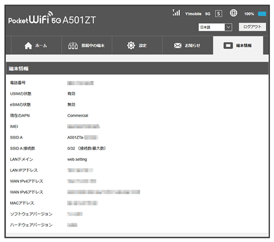 | WAN IPv6アドレス | 本機に割り当てられたIPv6アドレスです。このIPアドレスでインターネットに接続します。IPタイプをIPv6もしくはIPv4/IPv6に設定しているAPNを使用する場合に表示されます。 | |
