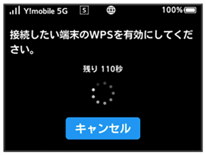 • ↓次の画面が表示されている間(120秒以内)に、無線LAN端末でWPS機能の接続設定を行う