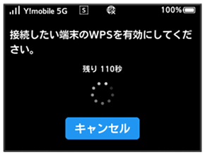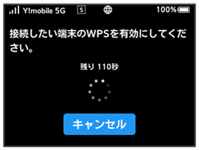 • ↓次の画面が表示されている間(120秒以内)に、アクセスポイント端末でWPS機能の接続設定を行う