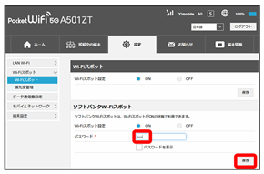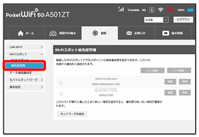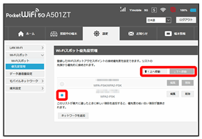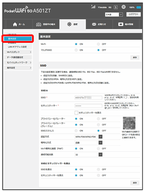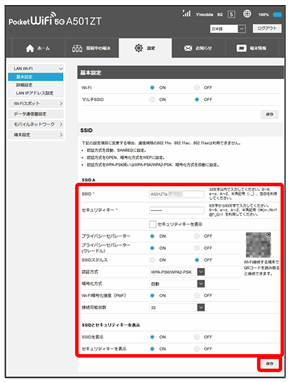 | SSID | 接続する無線LAN端末に表示されるWi-Fi名(SSID A)を設定します。 お買い上げ時の設定:A501ZTa-XXXXXX(6桁の英数字) |