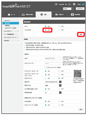 Wi-Fi名(SSID A)について無線LANの基本的な設定を行います。