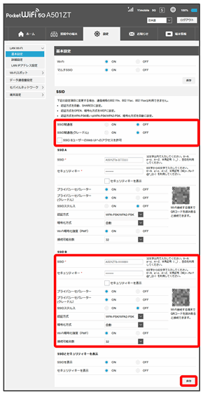 Wi-Fi名(SSID A)のLAN Wi-Fi基本設定が設定されます。