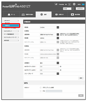 | Wi-Fiチャンネル(5.0GHz)2 | 無線LANのチャンネルを設定します。 お買い上げ時の設定:自動(100-140) |