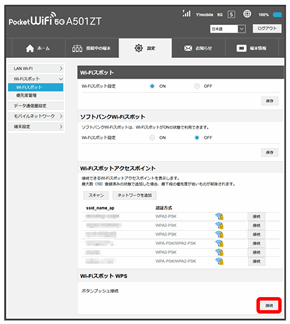 WPS機能対応の無線LAN端末と接続します。Wi-Fi名(SSID)のSSID AとSSID Bそれぞれに接続することができます。