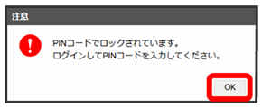 本機の電源を入れてパソコン接続したときに、パソコンからWEB UIへアクセスしようとすると、「PINコードでロックされています。ログインしてPINコードを入力してください。」という注意画面が表示されます。