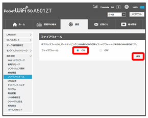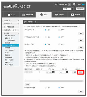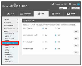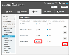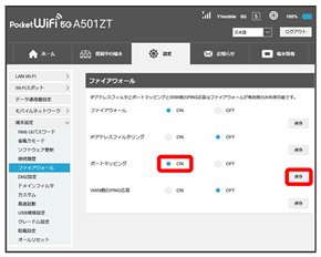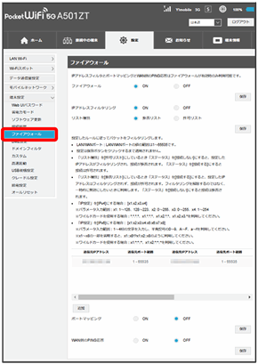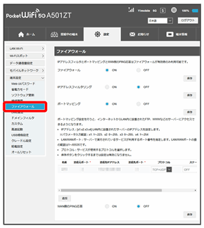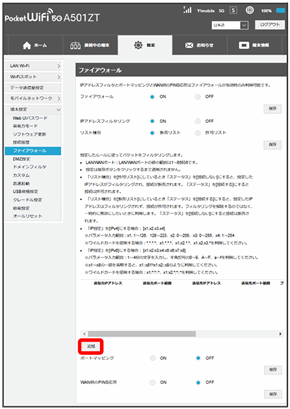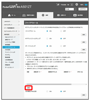 ファイアウォールがONになり、IPアドレスフィルタリングとポートマッピング、WAN側のPING応答が設定できるようになります。