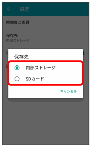 お買い上げ時、本機で撮影した静止画や動画は、内部ストレージに保存されるように設定されています。SDカードに保存する場合は、保存先の設定を変更してください。
