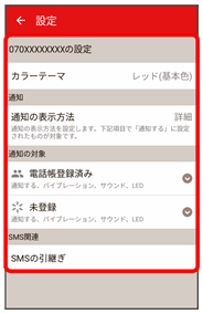 | 未登録 | 電話帳に未登録の相手からメールを受信したときの通知方法を設定します。 | |