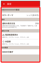 | 未登録 | 電話帳に未登録の相手からメールを受信したときの通知方法を設定します。 | |