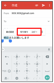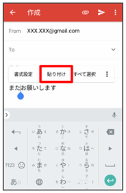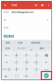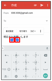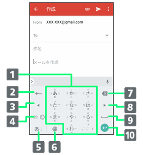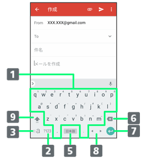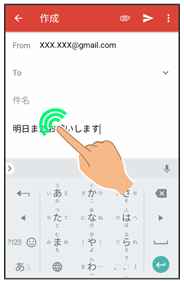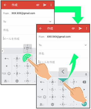 キーを上下左右にフリックすることで、キーを繰り返しタップすることなく、入力したい文字を入力できます。キーをロングタッチすると、キー入力ガイドが表示されます。入力したい文字が表示されている方向にフリックすると、文字が入力されます。