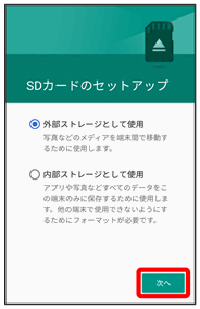 • 外部ストレージとしてフォーマットすると、内部ストレージ化したときにSDカードに保存したデータはすべて削除されます。SDカードに保存していたアプリなどは使用できなくなりますので、十分ご注意のうえ、ご使用ください。