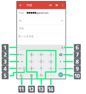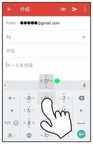 ケータイ配列で入力するとき、キーを上下左右にフリックすることで、キーを繰り返しタップすることなく、入力したい文字を入力できます。キーに触れると、フリック入力で入力できる候補が表示されます。入力したい文字が表示されている方向にフリックすると、文字が入力されます。
