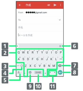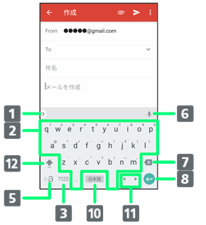 11. 文字入力モードを切り替えます(ひらがな/英字)。ロングタッチすると入力オプションが表示されます。