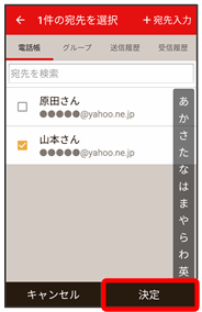 • 宛先入力をタップすると、宛先を直接入力できます。また、入力した宛先を電話帳に登録することもできます。