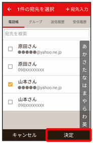• 宛先入力をタップすると、宛先を直接入力できます。また、入力した宛先を電話帳に登録することもできます。
