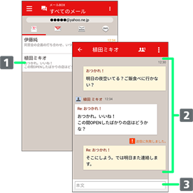 会話型表示では、宛先ごとに送受信したメールをまとめて表示します。たとえば、植田さんとやりとりしたメールを確認するときは、1つのスレッドの中で植田さんと会話をしているように表示されます。