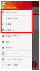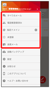 - すべてのメール/電話帳登録済み/未登録/迷惑メール