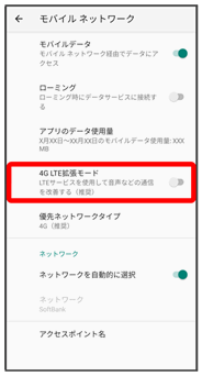 VoLTEは4Gサービスを利用します。本機の4Gサービスが無効になっているときは、利用できません。VoLTEが利用できないときは、次の操作で4Gサービスが有効(