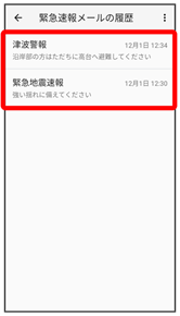 緊急速報メール受信メッセージ一覧画面が表示されます。