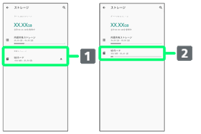 | 写真、動画、音楽 | データ作成時、内部ストレージ/SDカードに保存されます。SDカードが挿入されていない場合は、内部ストレージに保存されます。 |