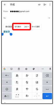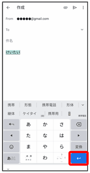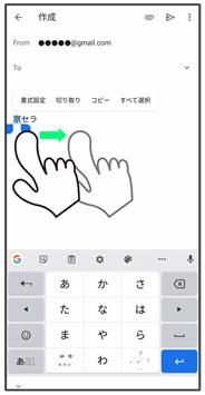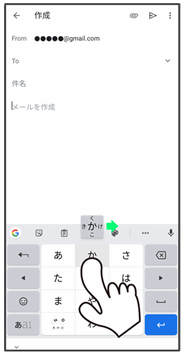 ケータイ配列で入力するとき、キーを上下左右にフリックすることで、キーを繰り返しタップすることなく、入力したい文字を入力できます。キーに触れると、フリック入力で入力できる候補が表示されます。入力したい文字が表示されている方向にフリックすると、文字が入力されます。