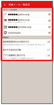 • ↓新着メール一覧設定画面でアプリ起動時に表示する