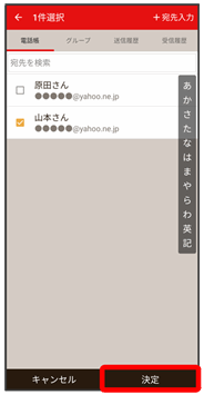 • 宛先入力をタップすると、宛先を直接入力できます。また、入力した宛先を電話帳に登録することもできます。
