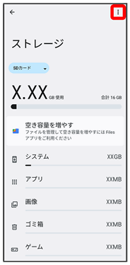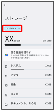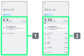 | 写真、動画、音楽 | データ作成時、内部ストレージ/SDカードに保存されます。SDカードが挿入されていない場合は、内部ストレージに保存されます。 |