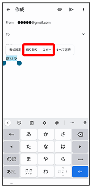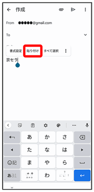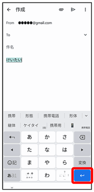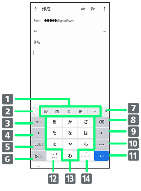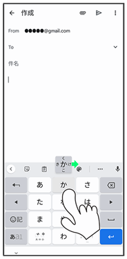 ケータイ配列で入力するとき、キーを上下左右にフリックすることで、キーを繰り返しタップすることなく、入力したい文字を入力できます。キーに触れると、フリック入力で入力できる候補が表示されます。入力したい文字が表示されている方向にフリックすると、文字が入力されます。