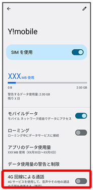 • 4G 回線による通話をタップするたびに、ON(androidone-s9_icon_048)/OFF(androidone-s9_icon_049)が切り替わります。
