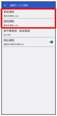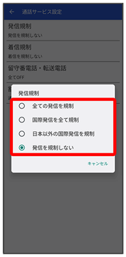 • 発着信規制中に電話やSMSを発信しようとすると、発信できない旨のメッセージが表示されます。お客様がご利用になる地域によっては、表示されるまでに時間がかかることがあります。